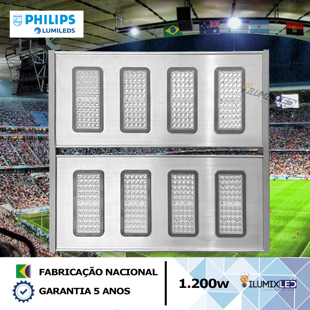 O Refletor LED STADIUM SMD 1.200w Modular de alta potência da linha profissional foi projetado com design moderno, a melhor qualidade em materiais e componentes, é um Refletor LED totalmente diferenciado do mercado, com fabricação nacional 100% Brasil, produção exclusiva, desenvolvido em alumínio extrudado e anodizado tem alta performance e melhor rendimento por utilizar LED LUMILEDS Philips®, baixa manutenção, ótima dissipação de calor, proporcionando maior durabilidade e vida útil, sem comparação aos refletores LEDS convencionais vendidos no mercado ou importados da China.